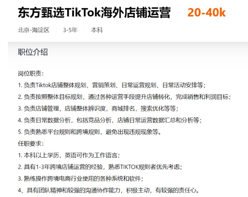 不止小杨哥,东方甄选最近也开始“招兵买马”加速出海计划,在招聘平台上挂出多个TikTok电商业务的岗位,包括海外店铺运营、内容运营经理等。其他像辛选、交个朋友、遥望科技等国内头部直播机构,前两年就吹响了征战海外市场的号角。