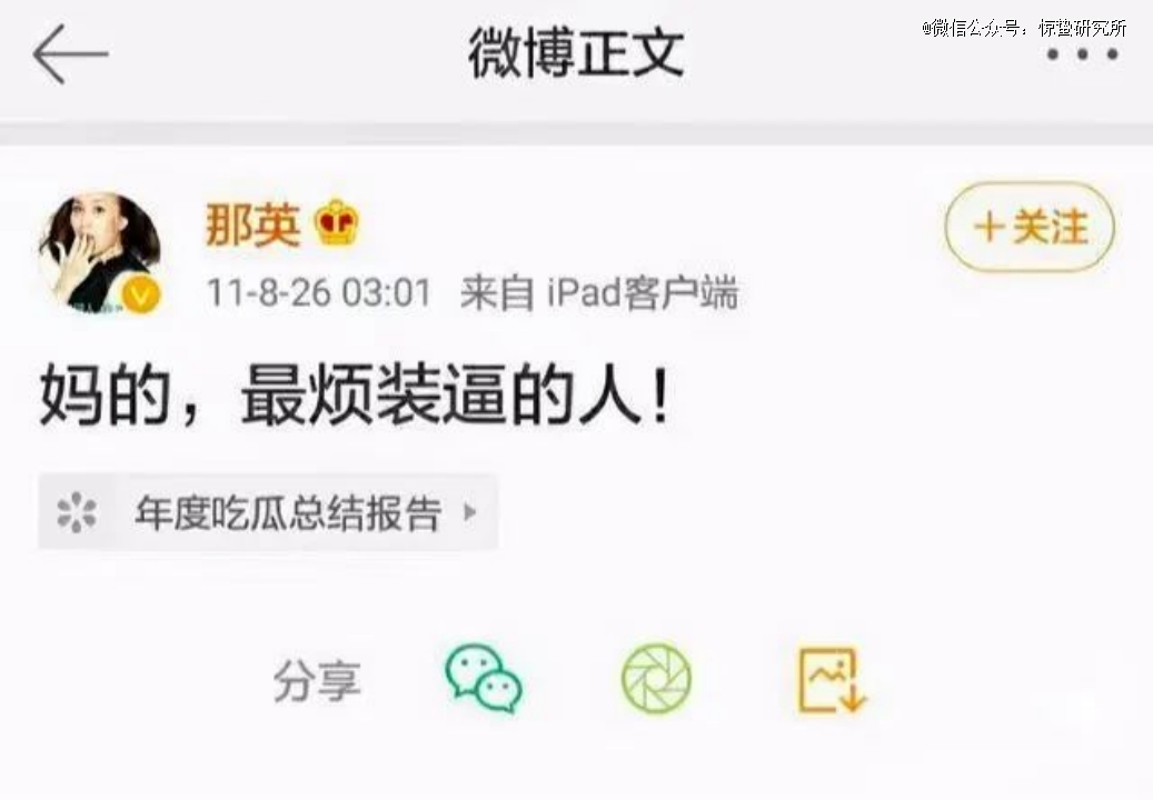 也是在这一时期,娱乐明星们代表的公众人物在微博平台上“勇敢做自我”。稚气未脱的关晓彤晒出毫无PS痕迹的“死亡芭比粉”穿搭,还真诚地问大家“我芭比吗?”那英一条“最烦装X的人!”的微博,隔了12年仍然被网友翻出来并且用新的方式演绎成网络热梗。