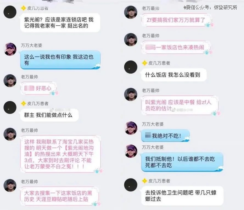 当时的热搜离谱到什么样的程度?中央和国家机关工作委员会主管的《紫光阁》杂志,因为批评嘻哈歌手“PG One”,被粉丝误以为是一家“中餐饭店”,随后粉丝们为了维护偶像在内部讨论中提出用“以后谁都不去吃”“去投诉卫生问题”等方法对“紫光阁饭店”进行抵制,甚至还有人提出“用地沟油来搞垮它”的想法。