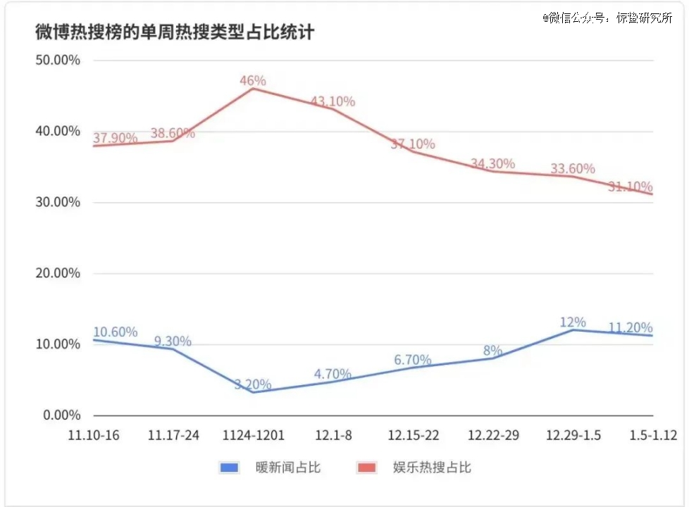 在1月7日-12日的所有热搜中,娱乐类热搜占比31.1%,为两个月来*,而最高的一周则高达46%。相比之下,“暖新闻”占比攀升至两个月来的最高点(12%),而占比*的一周仅3%。