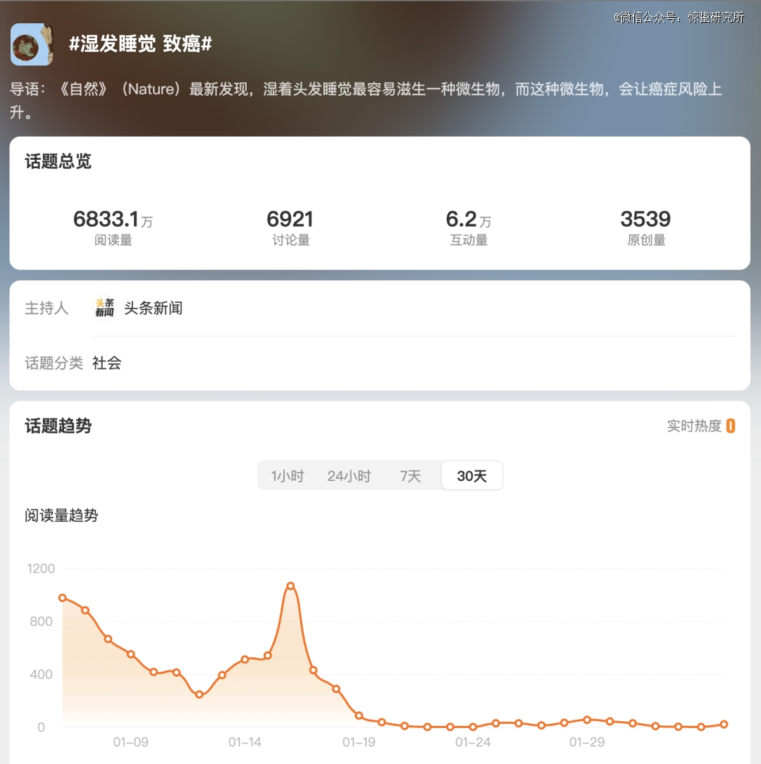去年12月18日,新浪系微博账号“头条新闻”主持的话题#湿发睡觉致癌#,一度冲上热搜榜第二。不到两周后,梨视频主持话题#经常湿头发睡觉致癌是假的#,并且在话题正文中特别提到“最近社交平台上出现湿发致癌的谣言”进行辟谣。但这则辟谣话题不但没能吸引到与谣言话题相匹配的流量,“头条新闻”等新浪旗下账号也并未现身帮助辟谣。