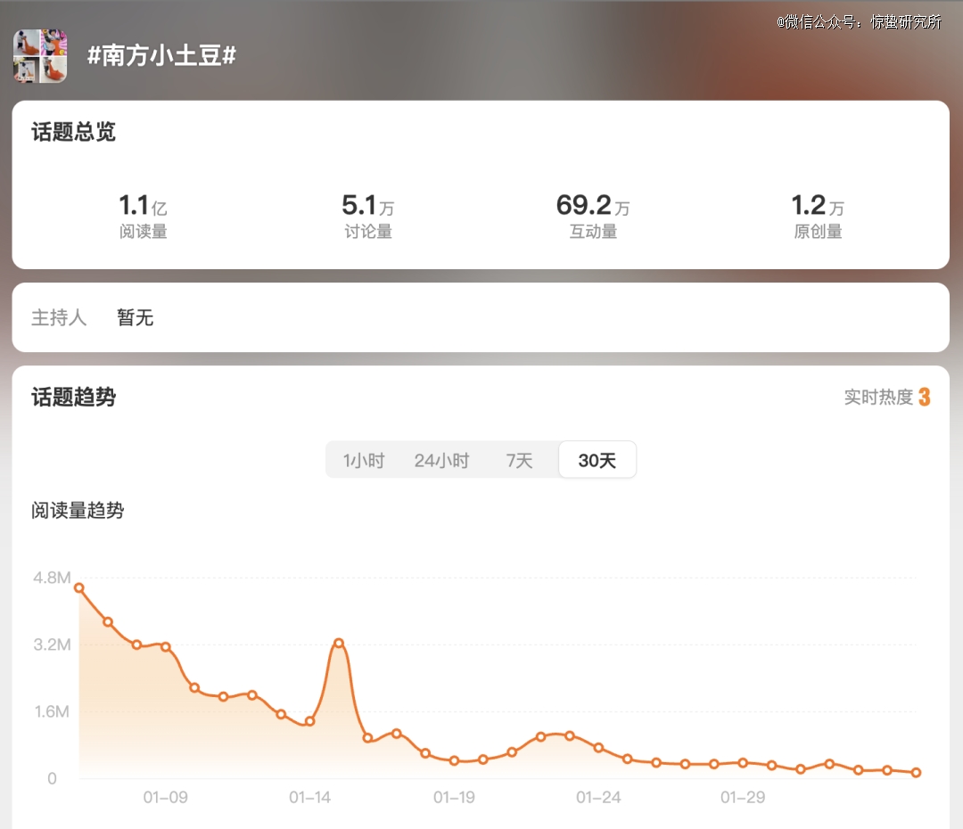 1月3日上午,#南方小土豆刻板印象#在冲上热搜第4名之后,出现了热度暴跌的情况。但很快,相对中性的话题词#南方小土豆#就成功接力上榜。当天下午,微博上演绎“小土豆”刻板印象的内容,让#小土豆文学#词条突然吸引大量关注,争论南北差异以及性别对立的声音再次充斥微博。