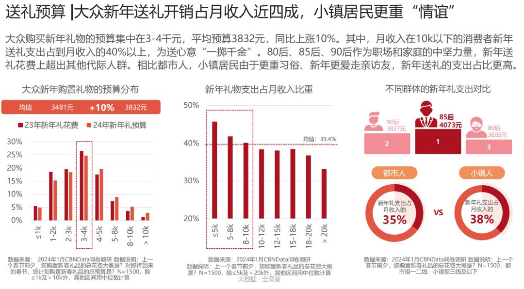 这些年轻人的送礼花销并不算特例,据CBNData数据显示,大众购买新年礼物的预算集中在3000-4000元,同比上涨10%。其中,月收入在1万以下的消费者,新年送礼支出占到月收入的40%以上,为送礼“一掷千金”。