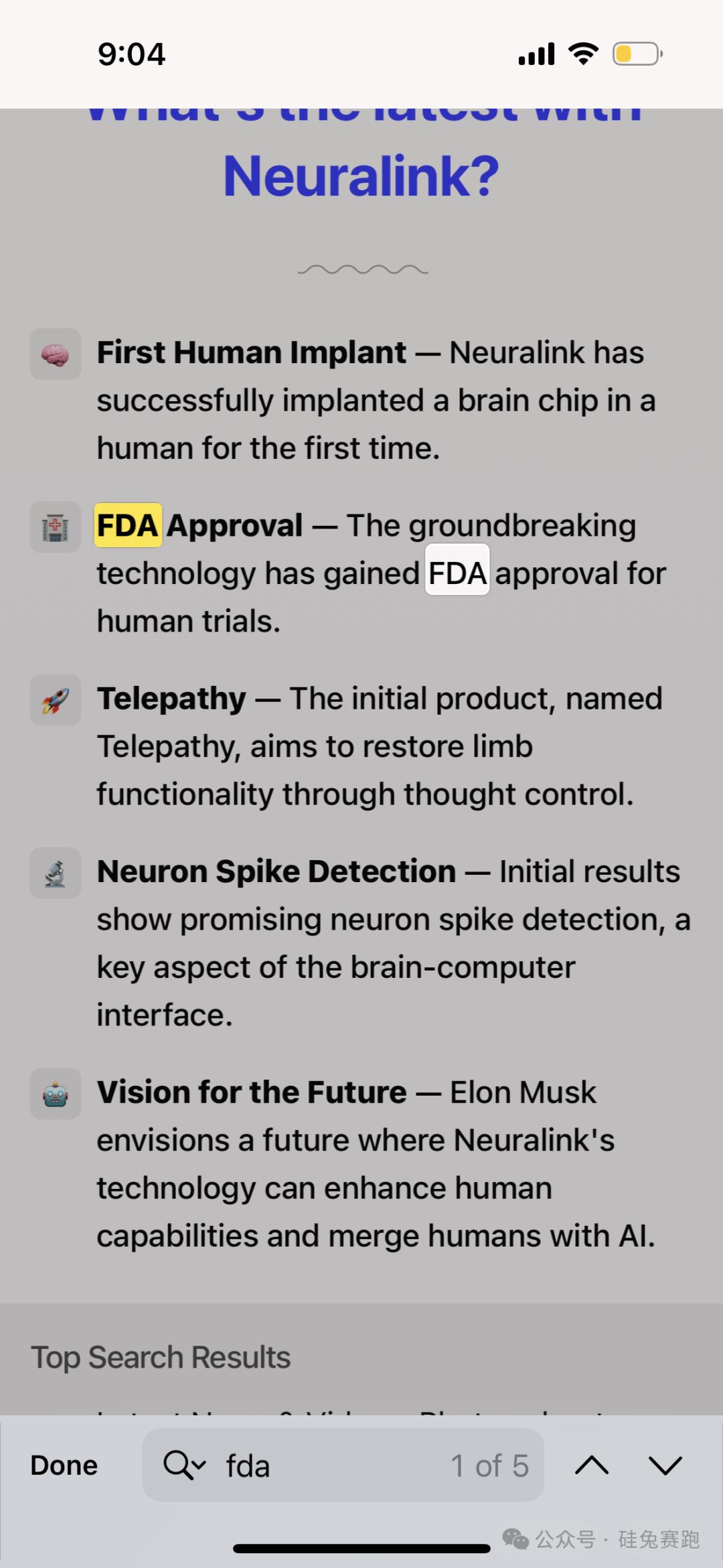 不仅适用于“如何”类的问题,Arc Search的总结对于快速了解一项话题来说也很有用,比如搜索“ Neuralink 的最新进展是什么?”Arc Search就会将Neuralink的首个人体芯片植入、FDA许可获得和首个产品意念控制等细节一一罗列,让用户可以在几分钟的时间内就完成信息获取。