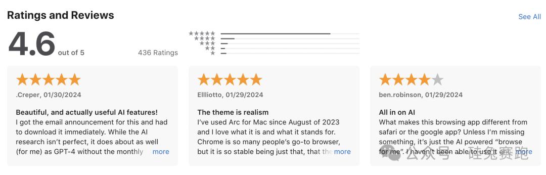 Arc Search刚推出,已经获得了一波来自科技媒体的好评,有科技博主称它已经取代了其他移动端搜索产品的地位,The Verge称它为“一种使用互联网的新方式”,Arc在App Store上的评分达到了4.6,用户对其美观和流畅的使用体验大肆赞赏,但因其版本尚新,还是有一些对浏览、插件和提示等功能的批评和建议。
