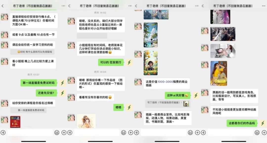 在直播前,机构老师还会发一些板绘作品,有标价100-300元的Q版头像、1000-3000元的商业插画,并询问学员在这些作品里是否有自己感兴趣的风格。一个有趣的现象是,当惊蛰研究所发出“为什么有些图AI感很重?”“这些作品是否都是你们所作?”等质疑时,培训机构的老师并没有正面回答。