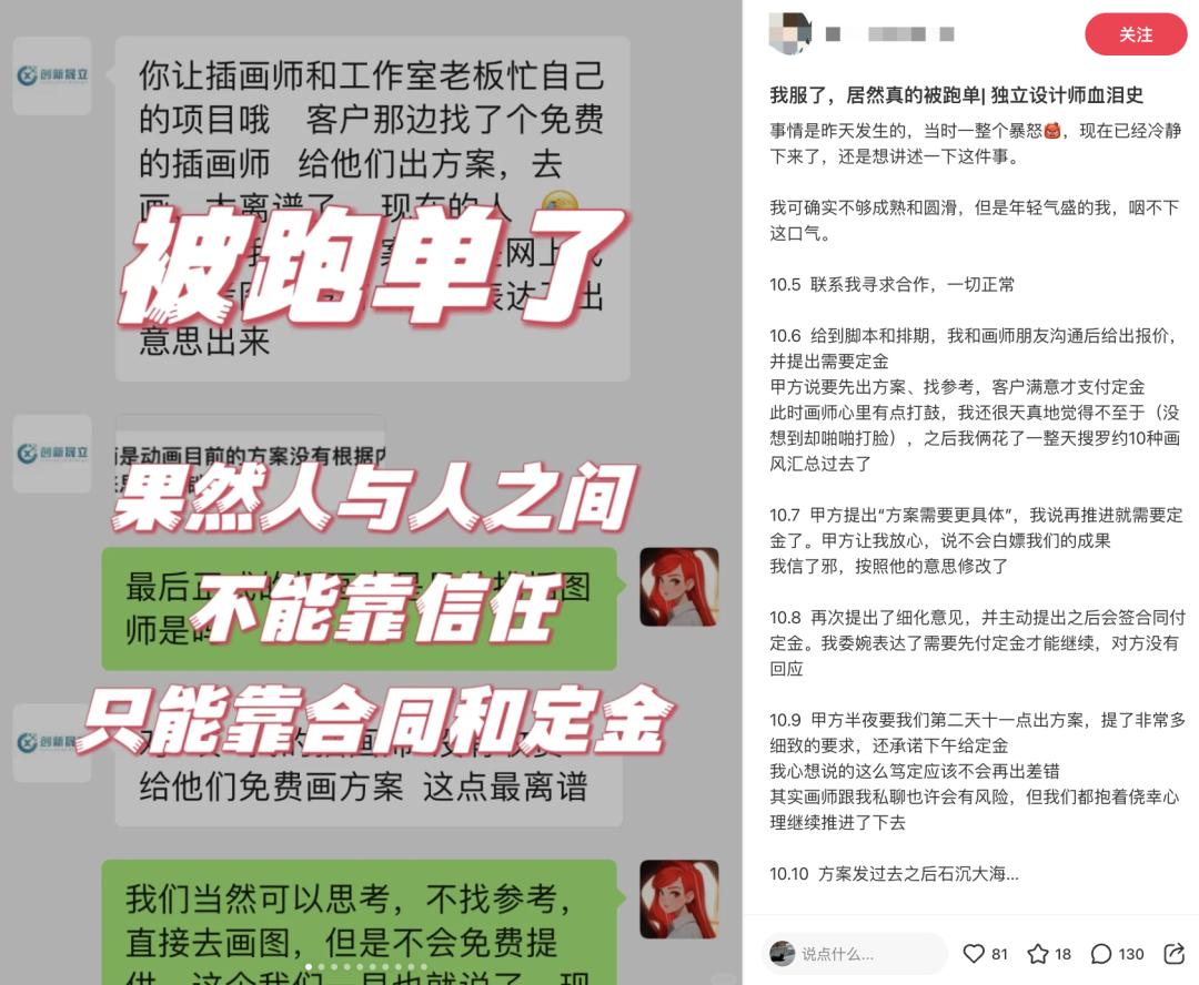 例如在被羡慕“时间自由”的同时,插画师们的收入并不稳定——不只是因为市场需求的变动,更因为高度依赖行业资源的合作模式存在被“跑单”的风险。在社交平台上,经常会有画师挂出自己被跑单、骗稿的经历。