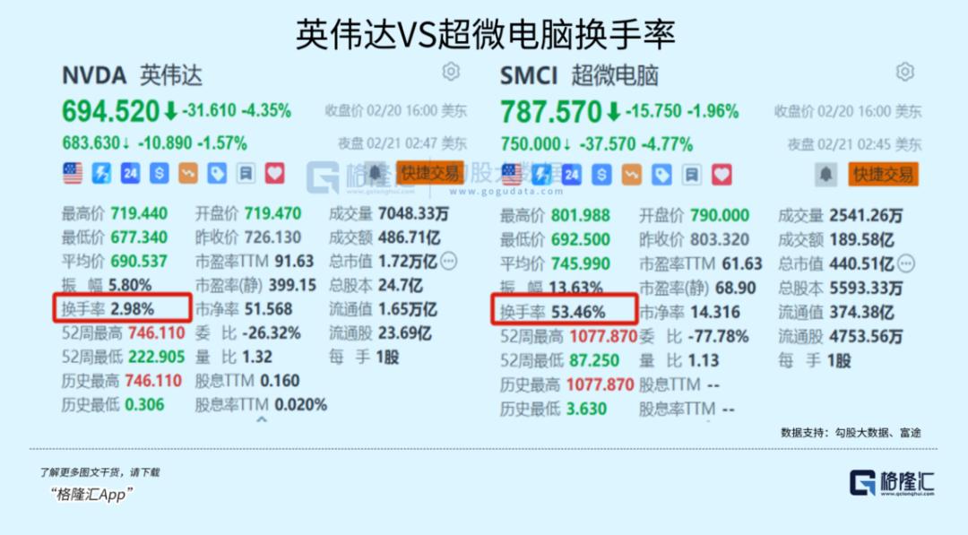 我们可以对比一下最近一个月英伟达和超微电脑的换手率。前者基本在1-3%之间波动,而后者在20-70%,在冲上1000美元的那段时间,换手率基本每天都达到50%。