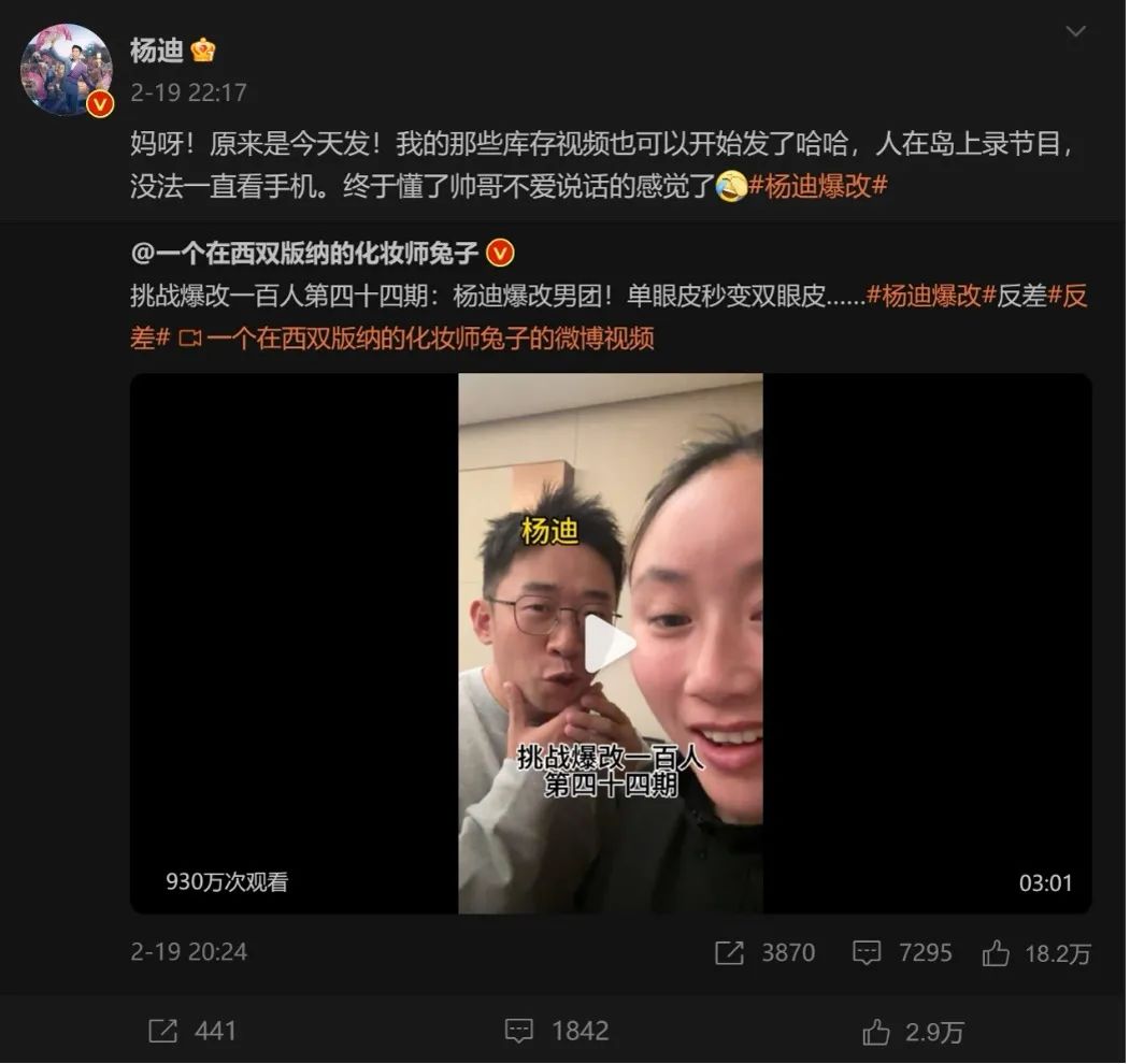 据新榜统计的数据,从爆改视频第一期发布后的70天,“化妆师兔子”全网涨粉超过313万,目前全网粉丝量超过817万。而像杨迪的爆改视频,截至目前抖音获赞近350万,相关话题“杨迪爆改”一度登上微博热搜第一,累计阅读量达到4亿,讨论量达到4.1万。