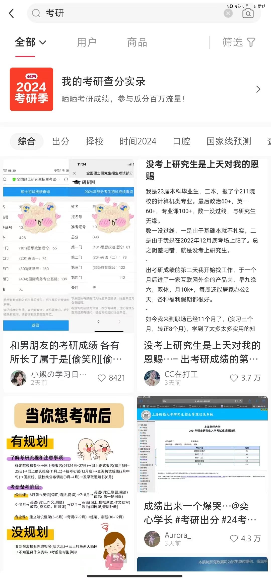 我们打开小红书,搜索“考研”相关字样,显示共有1263万篇以上的笔记,且界面将会自动给到关于考研的各类“亲身体验”。