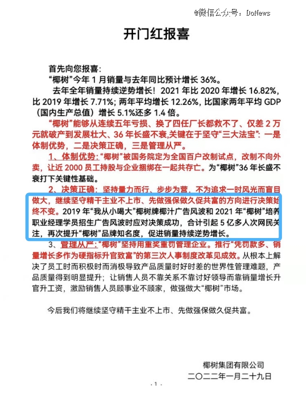 2022年初,在椰树官方集团官网发布了一则“开门红报喜”公告。喜报主要总结了去年销量提升的原因,其中赫赫然写着:“广告风波的应对决策成功,引起了5亿多人次网民关注,再次提升品牌知名度,促进销量增长。”可见,面对多次的警告和罚款,椰树集团显然不以为意,甚至大有把罚款算进广告支出的意向。