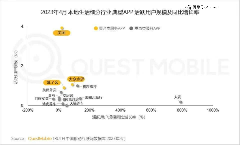 从上图也不难看出,原与美团进行全面对标的聚合类服务APP饿了么,现活跃用户规模及同比增长率数据更贴近于美团旗下垂直类服务APP美团外卖。