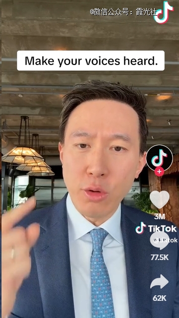 TikTok首席执行官周受资在TikTok发布视频表示,“如果这项法案被签署成为法律,将导致TikTok在美国被禁止使用……并将造成创作者和小型企业数十亿美元的损失,30万个美国工作岗位面临风险。”