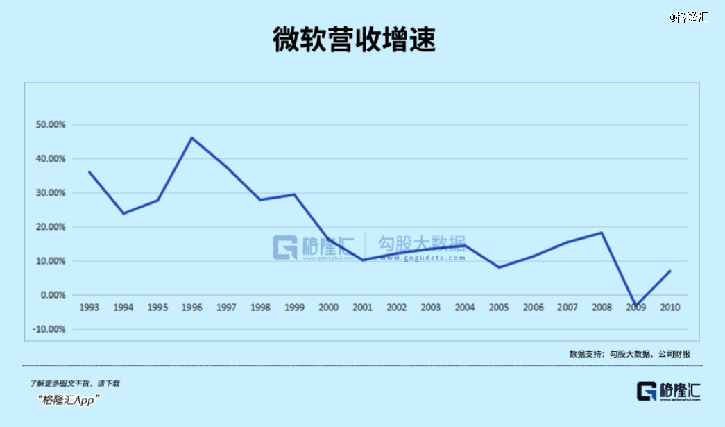 在接近十年的时间里,微软股价基本没有发生太大变化,却一直在消化2000年科网泡沫的高估值,主营业务增速从百分之三四十一路下滑。
