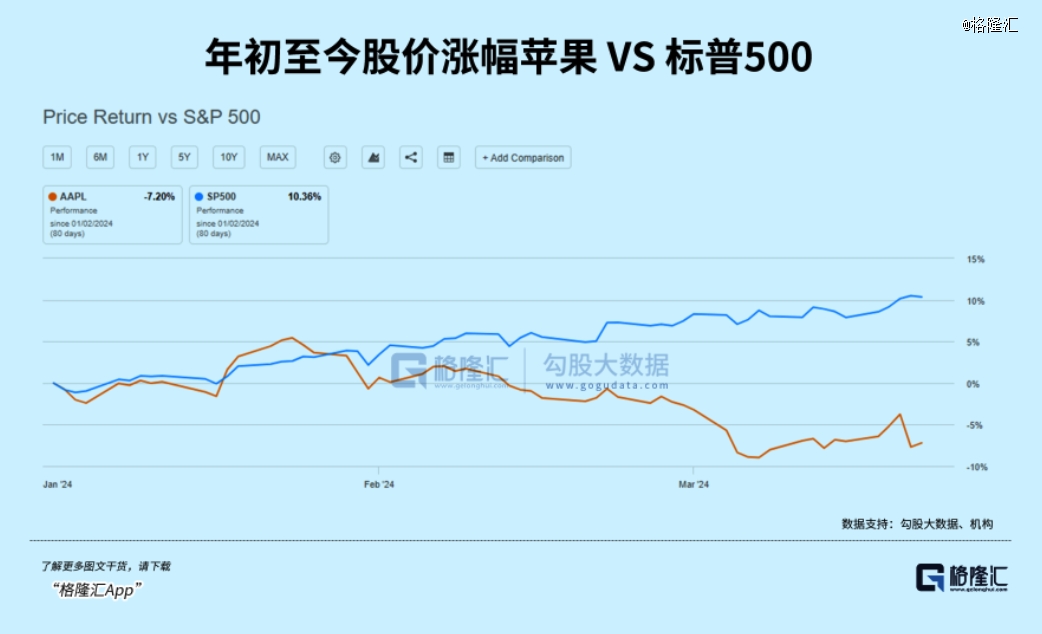 苹果公司从历史高点以来,回调接近13%。2024年迄今,苹果股价累计下跌大约10.5%,意味着在标普500指数的权重下降至大约5.7%,创2021年6月份以来新低。