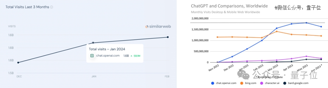 Similarweb最新统计数据显示,去年12月到今年2月,ChatGPT的月访问量大约在16亿上下。
