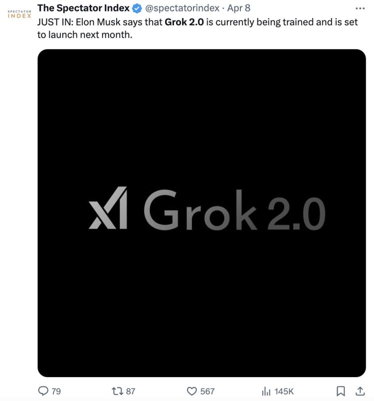而不只是Google,同一天,Grok 2.0的消息也传出。据报道,马斯克在一次采访中透露,自己的人工智能初创公司xAI正在2万张H100上训练Grok 2.0,并将于5月份推出。而且,他相信新版本不仅比GPT-4更强大,还将超越市面上所有大模型标准。甚至扬言训练Grok 3会用到10万张H100 GPU,到时就算GPT-5也会被秒成渣渣。