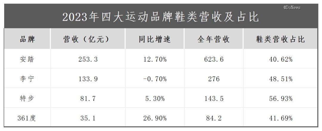 尽管库存承压,集体股价下跌,但是2023年四大运动品牌财报中仍凸显出一个共性:即运动鞋成为公司营收支柱,整体保持增长势头。如安踏、李宁、361度鞋履类营收占比均在40%以上,特步占比更是近57%。