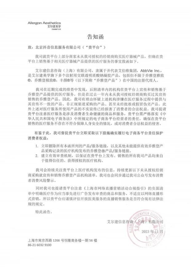 去年11月,有“玻尿酸领头羊”之称的艾尔建美学,向抖音发送了一封告知函。