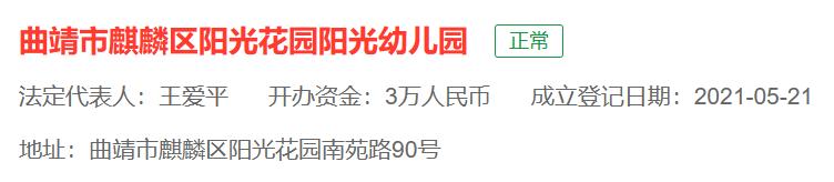 天眼查显示,阳光花园阳光幼儿园成立于2021年5月21日,位于云南省曲靖市阳光花园南苑路90号,开办资金为3万元,法定代表人是王爱平。