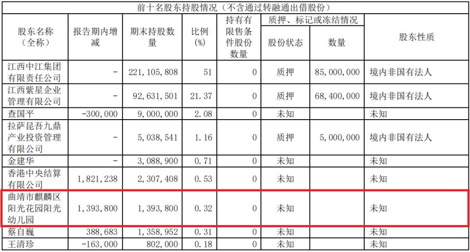 九鼎投资近日披露的2023年年报显示,曲靖市麒麟区阳光花园阳光幼儿园(以下简称“阳光花园阳光幼儿园”)以持有139.38万股成为公司第七大股东。