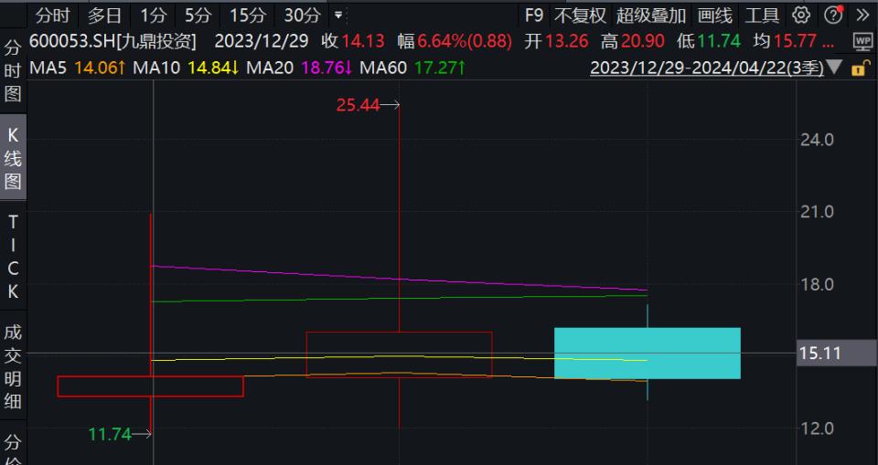Wind数据显示,九鼎投资2023年第四季度的最高价为20.90元,最低价为11.74元,成交均价约为15.77元/股。