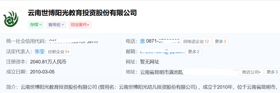 天眼查显示,云南世博公司(曾用名:云南世博阳光幼儿投资股份有限公司、昆明阳光幼儿投资有限公司)成立于2010年3月5日,注册资本2040.81万元,法定代表人是张莹,其是董事长兼总经理。