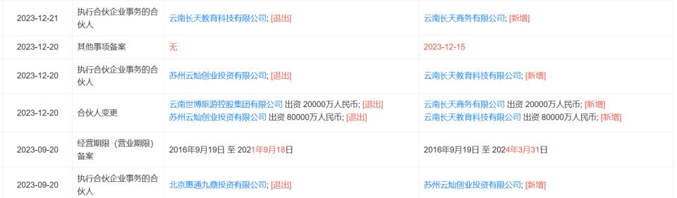 在成为云南世博九鼎企业的合伙人3个月后,即2023年12月20日苏州云灿创投选择了退出,同时退出的还有云南世博旅游集团,新进入的两个合伙人分别是云南长天商务有限公司(以下简称“云南天长商务”)和云南长天教育科技有限公司(以下简称“云南天长教育”)。