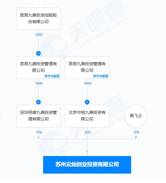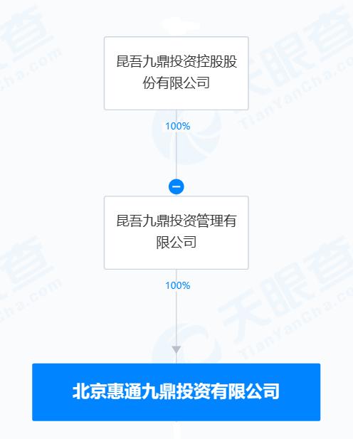 天眼查数据显示,北京惠通九鼎是九鼎投资的全资子公司昆吾九鼎投资管理有限公司(以下简称“昆吾九鼎”)旗下持股100%的企业;苏州云灿创投是昆吾九鼎旗下的深圳同德九鼎投资管理有限公司、北京中恒九鼎投资有限公司分别持股70%、20%的企业。