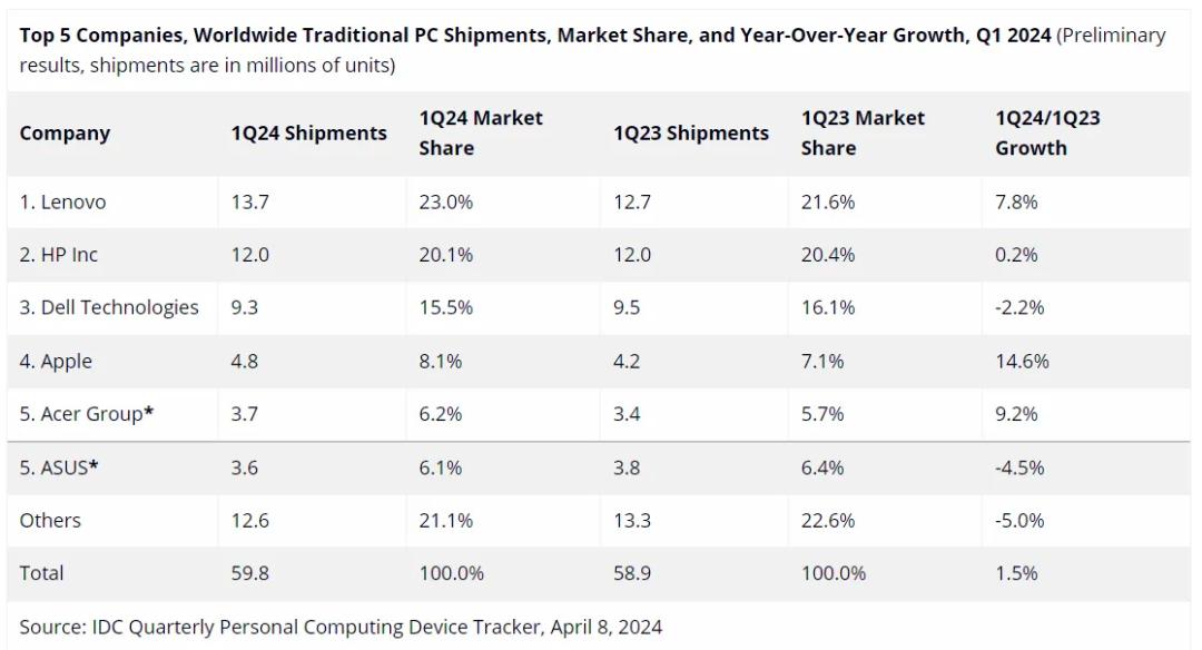从第三方数据看,AIPC的出现的确拉动了市场,但效果有限。IDC数据显示,2024年Q1,全球PC出货量同比增长3%,结束了连续两年的下滑趋势,恢复到疫情前的水平。