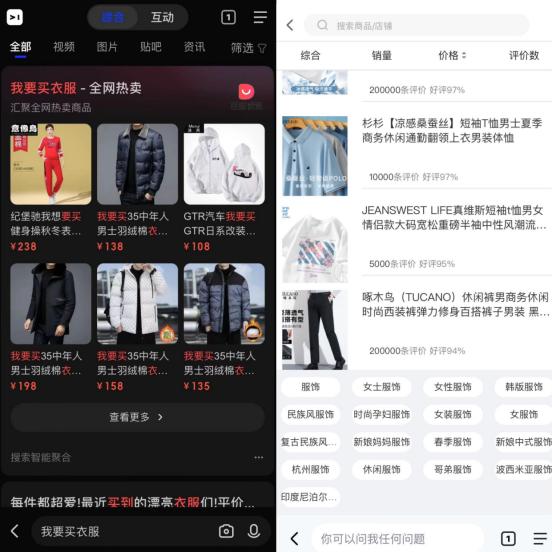 光子星球实测,在简单搜索App内提问:“我想买衣服”,传统搜索一栏立即出现了满屏明码标价的推荐服饰,切换到AI模式亦然。京东投放的服饰广告竟然比答案先一步出现,点击广告链接可直接跳转京东App购物页面。在这样情况下,在App内完成了搜索-跳转-引流-线索转化-购物达成的闭环。