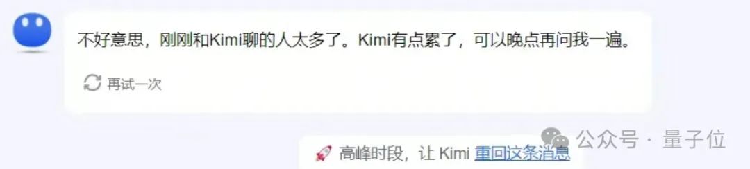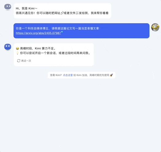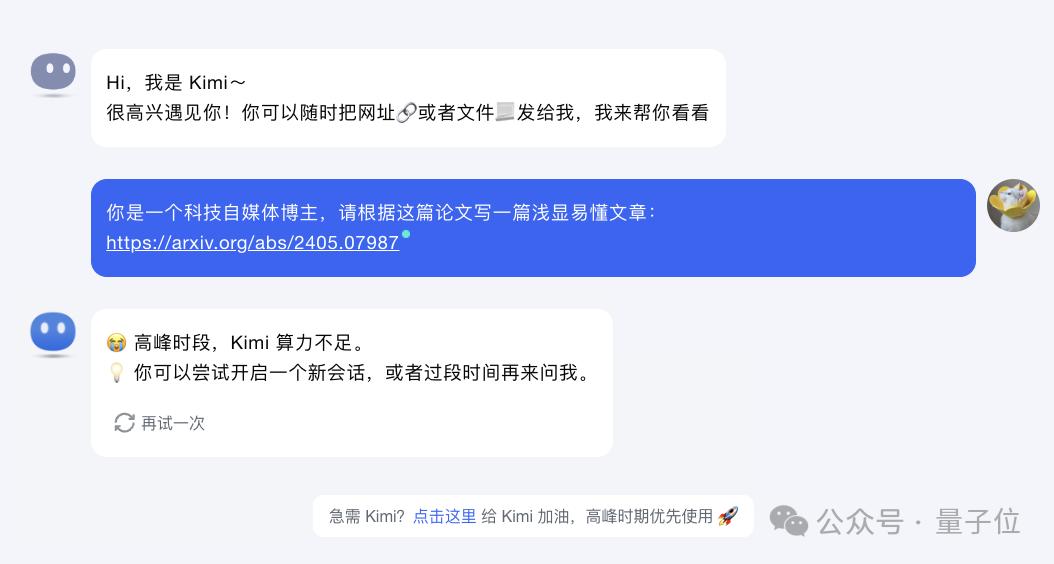 一旦它出现「高峰时段,Kimi算力不足」,底下就会想出现给Kimi加油的字样。一点击就成功触发。