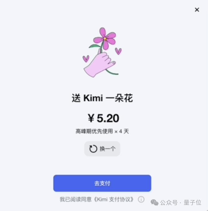 我在说Kimi最新的变化,新上线了打赏功能,统共6个档位。从一朵小红花到直接登月,价格从5块2到399元不等。
