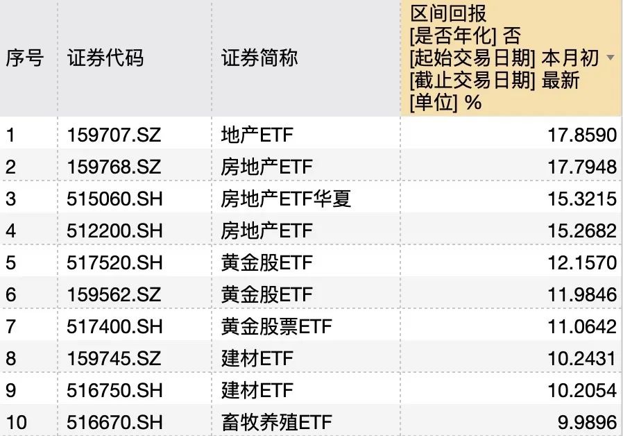 5月以来,地产、养殖及黄金ETF喜提收益排头兵。