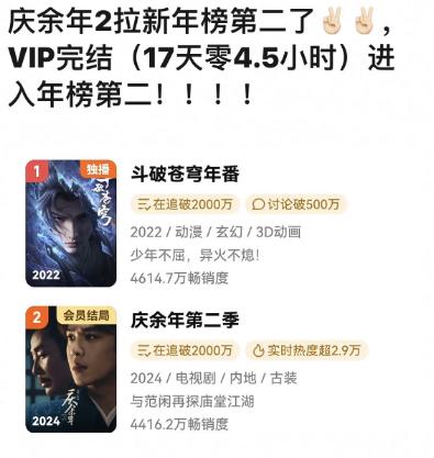 6月3日的VIP完结日,《庆余年2》登上年榜第二,仅次于《斗破苍穹年番》,在电视剧中排名第一。