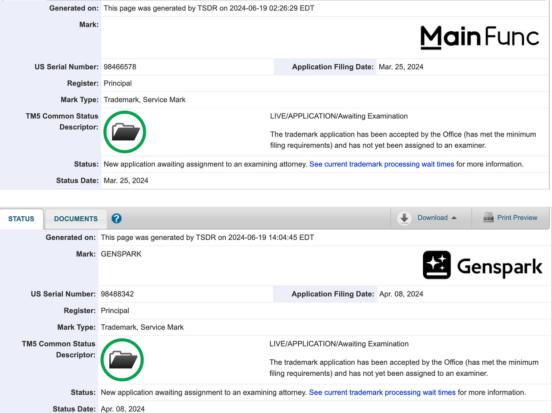 美国专利商标局官网信息显示,景鲲和朱凯华创立的“MainFunc”主体,于2024年3月25日提交商标申请。首款产品“Genspark”于2024年4月8日,提交商标申请,并在当月开通了“X”官方账号。