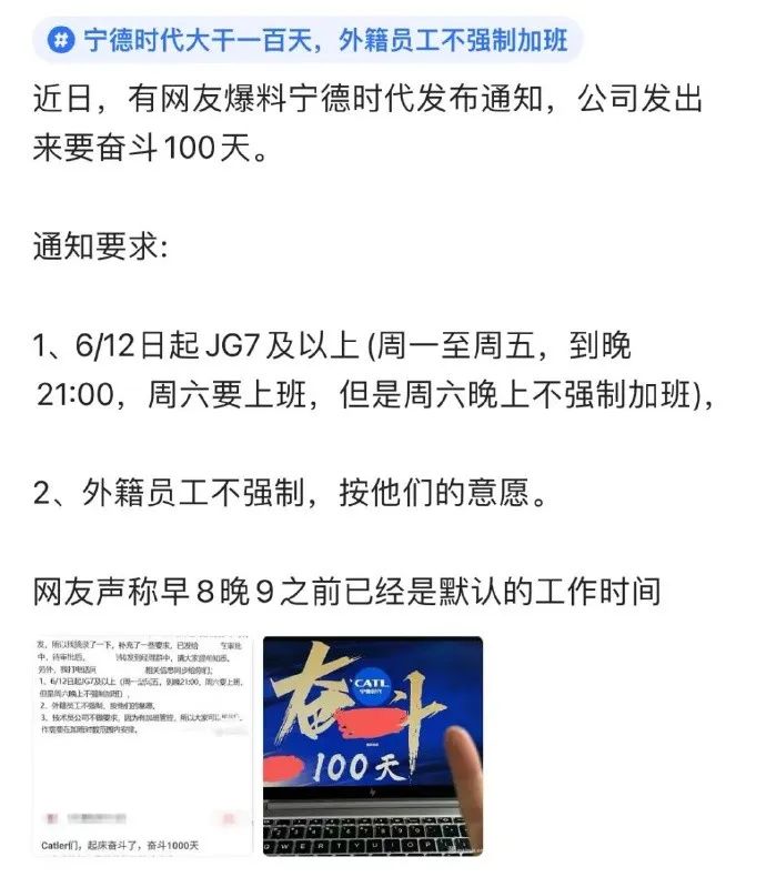 特别是在近期,有媒体报道称,宁德时代号召员工“奋斗100天施行896工作制”,即符合条件的员工从6月12日起,早上8点上班,晚上9点下班,每周工作6天,共“奋斗100天”。