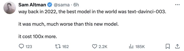 “2022年,当时世界上最好的模型是 text-davinci-003。它比这个新模型差得多,而它的成本高了100倍。” Sam Altman说,“最重要的是,我们认为人们真的会非常喜欢使用这个新模型。”