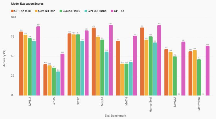 文本和视觉推理任务上,GPT-4o mini在MMLU中得分为82.0%,相比之下Gemini Flash得分为77.9%,Claude Haiku得分为73.8%。
