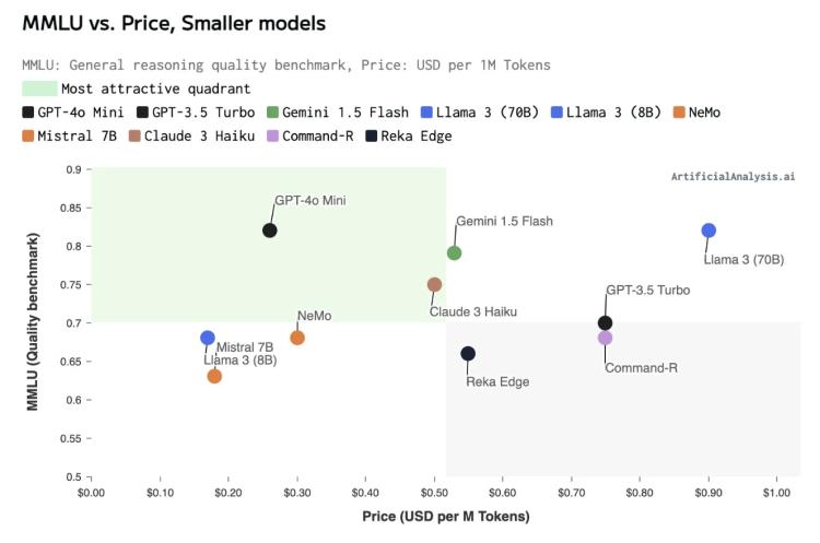 GPT-4o mini 与其它小模型在性能与成本上的综合比较。图源:Artificial Analysis