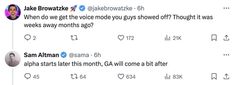 对于网友最关心的“什么时候才能开放语音模式”的问题,Sam Altman也给出了回复:“7月晚些时候推出测试版,公众访问权限更晚些开放。