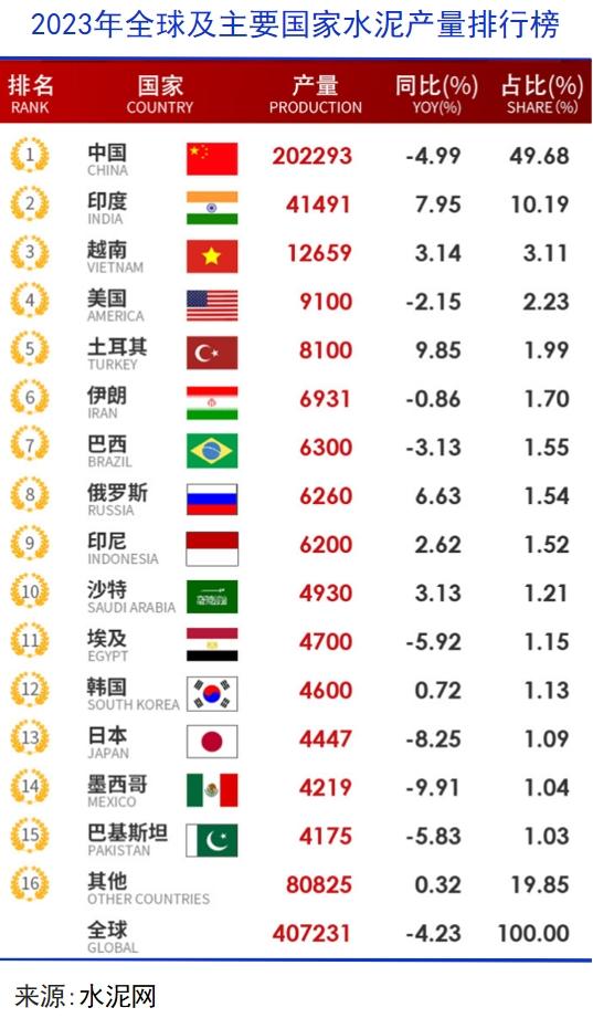 2023年,中国大陆粗钢产量10.19亿吨,占全球总产量的53.9%,消费量占据50.8%,均为世界第一。水泥方面,业内一直有“世界水泥看中国”的说法,2023年全球水泥产量40.72亿吨,中国以20.23亿吨的产量,自1985年以来,连续38年位居第一。