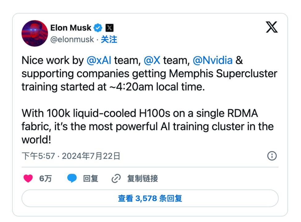 埃隆·马斯克在社交平台公开宣布,美国时间7月22日凌晨4:20,由xAI、X和英伟达等合力打造的“Supercluster”已开始投入训练。它由10万块H100组成,是目前世界上最强训练集群。