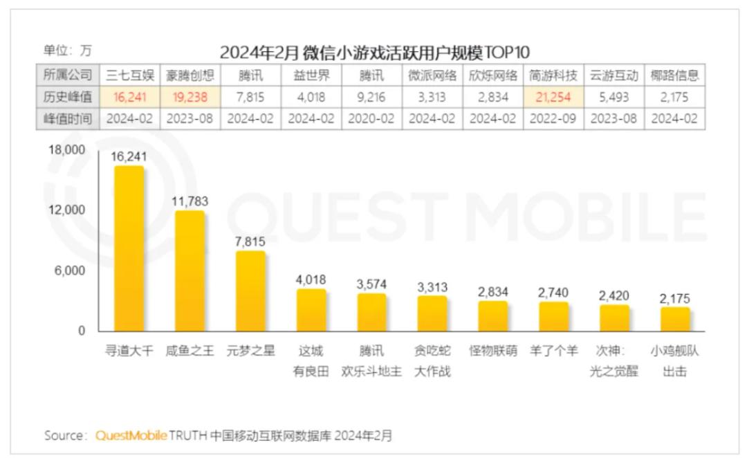 据Quest Mobile发布的报告显示,2024年2月三七互娱的《寻道大千》MAU高达1.6亿,疯狂游戏的《咸鱼之王》MAU高达1.17亿;中手游去年在小游戏赛道上营收6亿元,年内将上线《新仙剑奇侠传之挥剑问情》《火影忍者:木叶高手》在内等10款小游戏;恺英网络不仅计划年内上线《太上补天卷》《萌英雄》等小游戏,而且公司还将针对不同的品类增加小游戏的布局数量;即便是慢了几拍的完美世界,也在近期的财报中表示,公司正在积极研发轻量化小游戏。