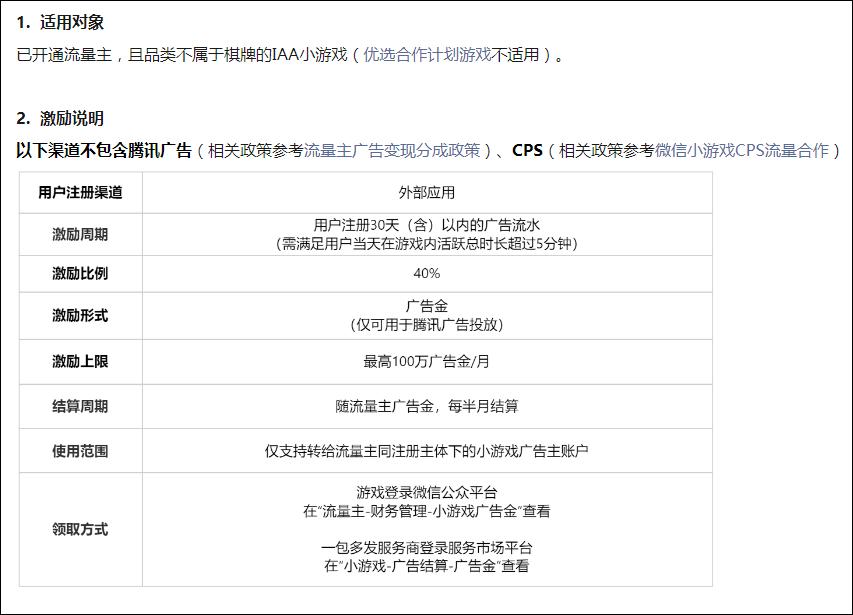 到了3月,微信小游戏平台又推出了IAA小游戏增长激励计划:不属于棋牌类的IAA游戏开发者的广告金激励比例提至最高40%;开发者通过海报分享注册用户达到一定量级可获得最高15万元的广告金激励。
