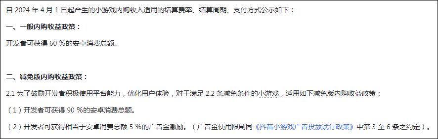 抖音这边也不甘示弱,在4月升级了小游戏激励政策,重新规定IAA小游戏与IAP小游戏的分成比例。其中IAA小游戏开发者在抖音上的广告收益最高提升至60%,IAP小游戏开发者更是能够获得最高90%的安卓消费分成。