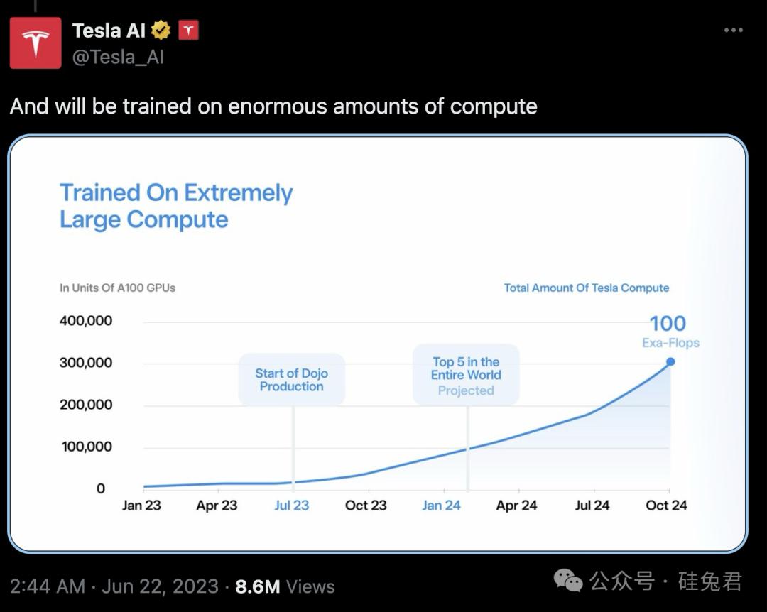在社交媒体X上,马斯克表示特斯拉将会拥有超过一百万辆联网汽车,这些汽车均配备了实现全自动驾驶所需的传感器和计算能力,并大力宣传Dojo的功能。