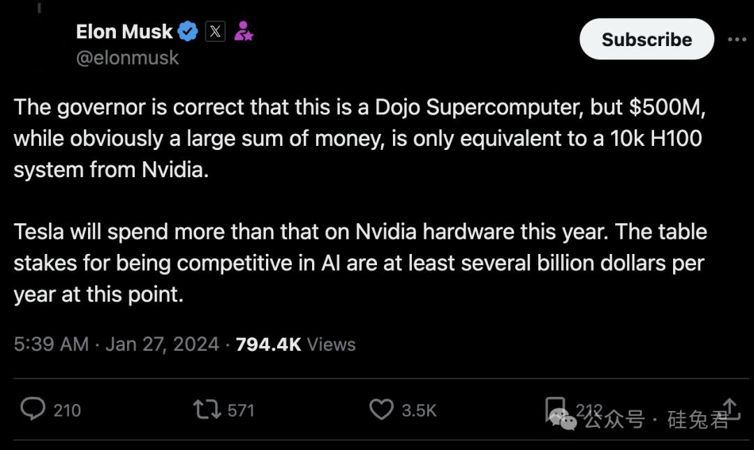 两天后,特斯拉宣布计划斥资5亿美元在布法罗打造一台Dojo超级计算机。马斯克在X上发帖称,虽然 5 亿美元是一笔大数目,但“仅相当于英伟达10k H100 系统。特斯拉今年将在英伟达硬件上投入更多资金。目前,(特斯拉)在AI领域保持竞争力的底线至少是每年数十亿美元。”