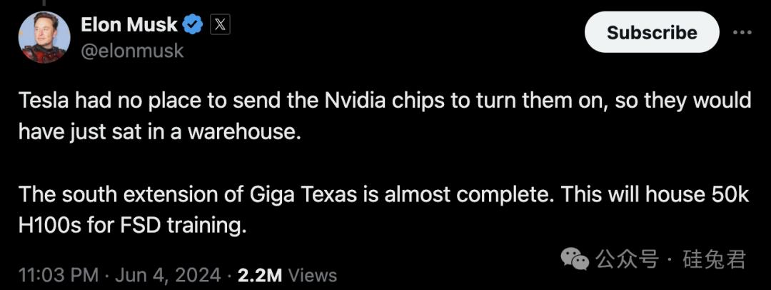 马斯克在X上发帖称,由于超级工厂Giga Texas的南部扩建工程尚未完成,所以没有地方做AI训练,英伟达GPU芯片也就还放在仓库里。据介绍,等到此次扩建工程完成,该工厂将“容纳5万台H100用于FSD训练”。