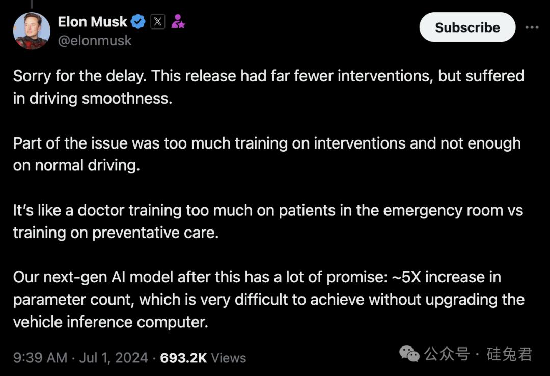 马斯克今年7月在X上透露,目前的特斯拉汽车可能没有适合该公司下一代AI模型的硬件。他说,如果不升级汽车推理计算机,“下一代 AI 的参数数量增加约 倍是很难实现的”。
